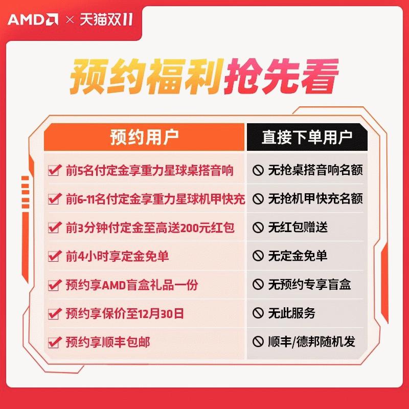 目前AMD在天猫商城和抖音平台旗舰店的重磅活动就是这些了,不过这仅仅是双十一大幕开启的预售活动啦,如果朋友们还想再继续观望一下的话再来选购也可以,每一阶段的福利各有不同,但是AMD都会尽最大心意让DIY玩家们满意,还请后续持续关注AMD官方旗舰店的各种大促活动哦。