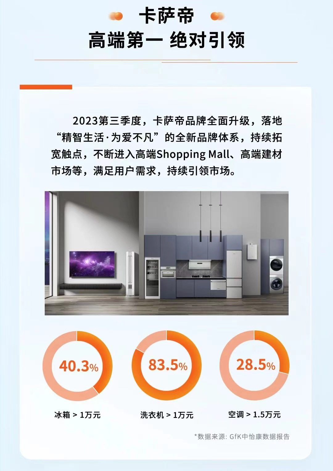 GfK中怡康数据显示,卡萨帝品牌在多个品类位居高端市场第一,10000元以上冰箱市场零售额份额为40.3%;10000元以上洗衣机市场零售额份额为83.5%;15000元以上空调市场零售额份额为28.5%。其中,卡萨帝冰箱、洗衣机份额较去年同比净增1.7个百分点和4.1个百分点。