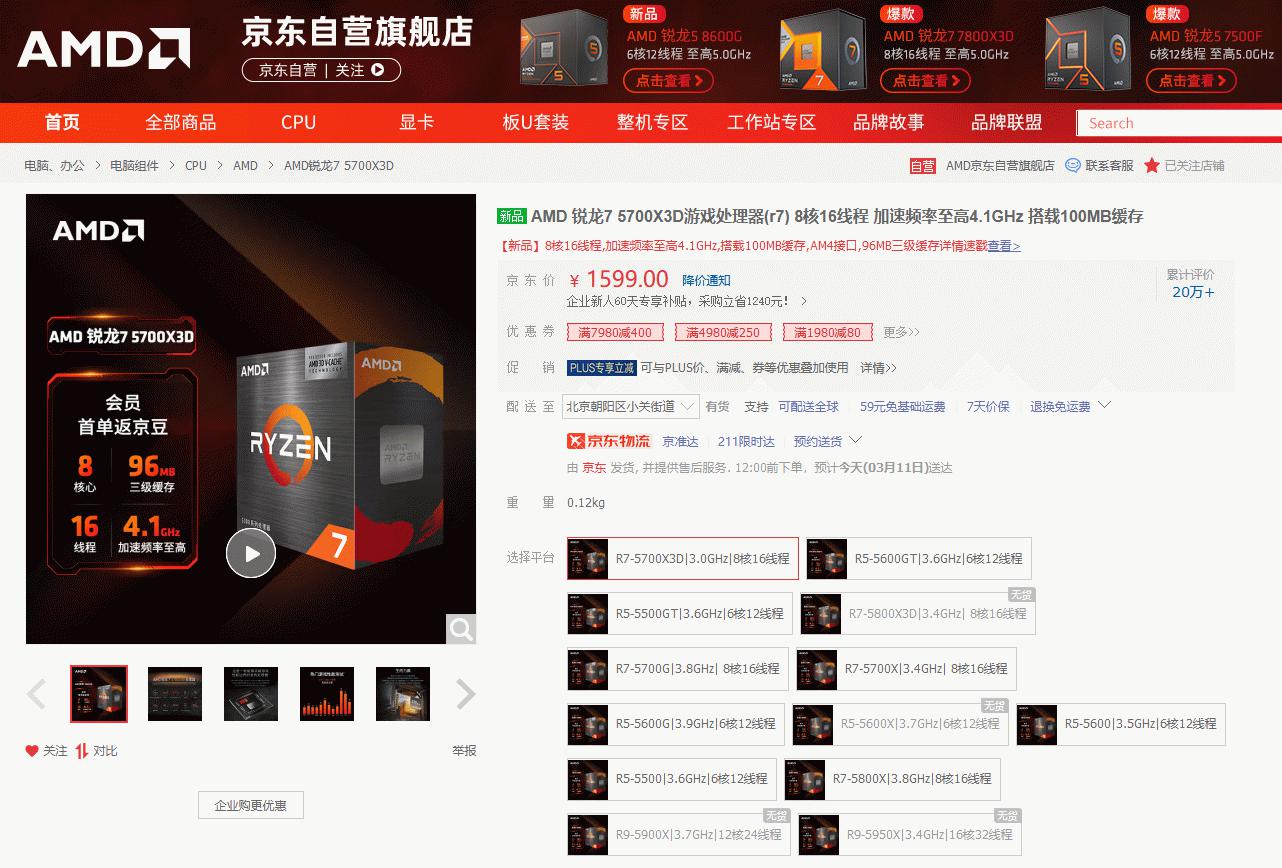 AMD 锐龙7 5700X3D处理器京东购买链接: