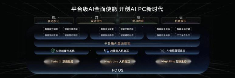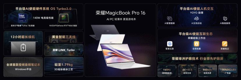 作为荣耀首款AI PC,荣耀MagicBook Pro 16基于平台级AI使能智能硬件、人机交互和多端生态,共同打造更懂用户的PC新体验。智能硬件层面,荣耀MagicBook Pro 16基于AI使能的荣耀OS Turbo 3.0技术,智慧识别和智慧调优产品的功耗和性能,打造高性能本续航标杆。AI使能的LINK Turbo技术加持,配合黄金智能三天线技术,实现超远距离联网。