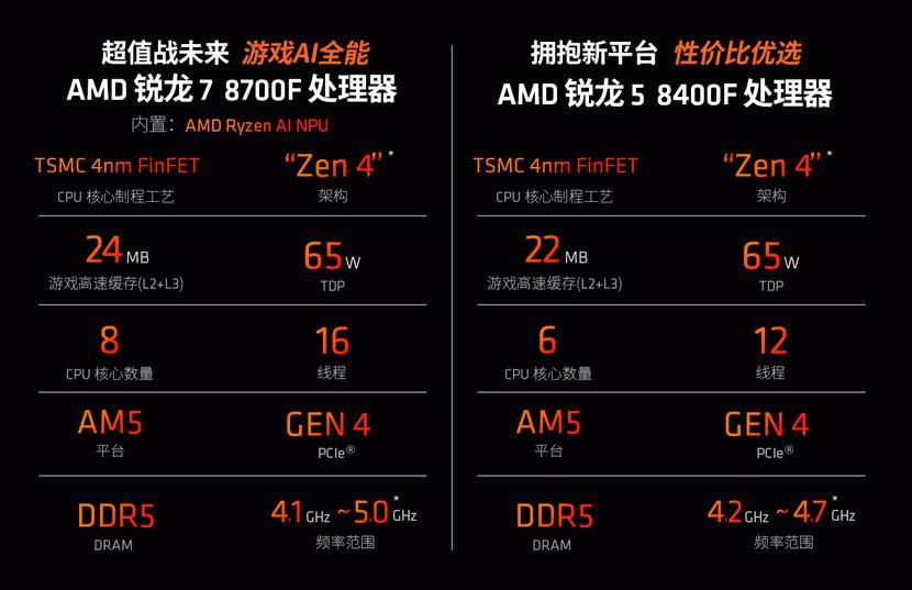 介绍完AMD 锐龙8000F系列整机的首发活动,接下来再为还不是很了解这两款新品的DIY玩家们详细介绍一下AMD 锐龙7 8700F处理器和AMD 锐龙5 8400F处理器,因为它们就是打造这些新晋网红整机的“核芯”机密。