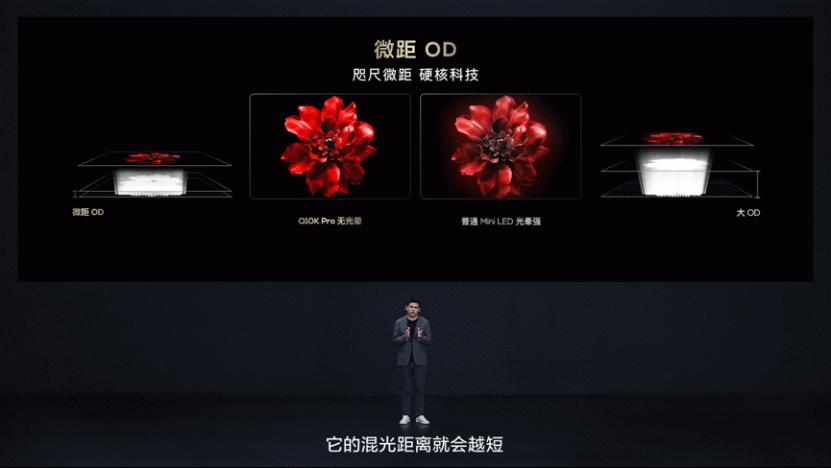 Q10K Pro还采用微距OD的技术方案。OD值指的是背光灯版到扩散板之间的距离,Mini LED电视的OD值越小,混光距离就越短,不同分区之间的光线就不会存在相互之间的串扰,光晕控制能力就越强。Q10K Pro搭载的微距OD技术,能让电视在光晕的控制上如虎添翼,配合超聚光微透镜等硬核控光技术,可以彻底终结Mini LED光晕问题。