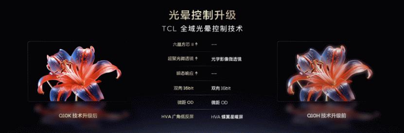 为了进一步提升画质,Q10K Pro还采用TCL独有的全域光晕控制技术。这项技术通过六晶方芯II、超聚光微透镜、瞬态响应和双向16bit、微距OD以及HVA广角低反屏等先进技术,有效解决了光晕问题。