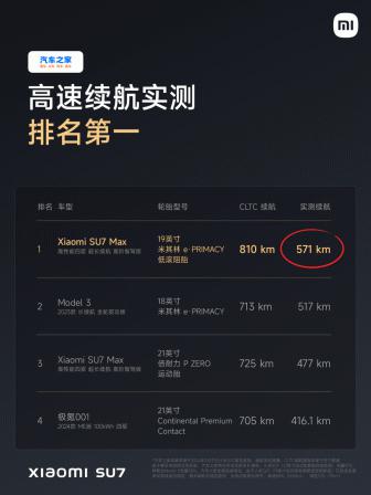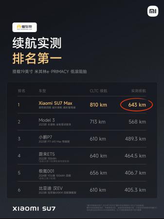 根据懂车帝、汽车之家、易车网等三家专业汽车垂直媒体的续航测试,小米SU7在各榜单所有车型的实测续航里程均排名第一。在专业汽车媒体新出行的高速 NOA横评中,小米SU7实现全程零接管,媲美小鹏和华为,达到行业领先水平。