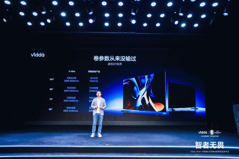 “可以说,卷画质,Vidda从来没输过。”发布会上,Vidda电视产品主理人介绍,本次发布的新品Mini LED全系列均具备千级以上分区,X85 Ultra稳定峰值亮度可达XDR 2600nits,100/75/65英寸则是XDR 2500nits,是目前同等价位段中亮度最高的产品。搭配了八晶方芯蓝宝石光学、AM背光驱动芯片等技术后,Vidda X Ultra的超高的亮度保证了即便是在阳光直射的客厅,用户也可以看清屏幕上的内容。除了超高亮度之外,Vidda X100 Ultra拥有2304分区精细控光,每个分区可以单独控制亮度,做到了明暗有细节、纵深有层次,不仅高亮环境看得清,暗光环境下看亮度自适应也不刺眼。