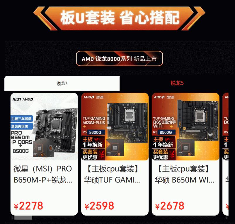 AMD京东自营旗舰店爆款提前购阶段包含了多种DIY商品,不仅有全新的锐龙8000系列处理器,还有最为热销的锐龙7000系列处理器和经典的锐龙5000系列处理器,同时还有板U套装和卡U套装的超值搭配,钜惠享不停。