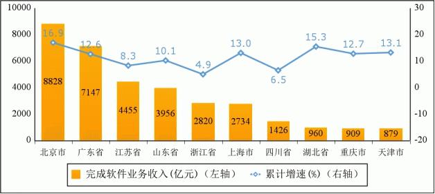 主要软件大省收入占比小幅提高。1-4 月份,软件业务收入居前 5 名的省份中,北京、广东、江苏、山东、浙江软件收入分别为 8828 亿元、7147 亿元、4455 亿元、3956 亿元和 2820 亿元,分别增长 16.9%、12.6%、8.3%、10.1% 和 4.9%,五省 (市) 合计软件业务收入 27206 亿元,占全国比重为 71.8%,占比较去年同期提高 0.3 个百分点。