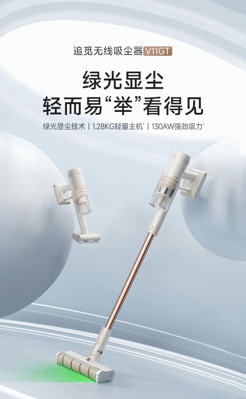 追觅 V11GT 手持吸尘器 搭载绿光显尘技术,拥有 1.28kg 轻量机身 + 130AW 强劲吸力,日常售价 1299 元。
