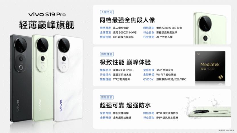 vivo S19 Pro全面向旗舰看齐,综合体验更加强大。天玑调校看蓝厂,vivo蓝晶技术栈与天玑9200+旗舰芯优化组合,充分释放最大潜能,跑分突破177万+。再加上4500nits 120Hz护眼屏、同档最薄IP68&IP69双重防水、超快超稳Wi-Fi 7等,真正做到不因轻薄而对体验妥协,成就手机中的“轻薄之王”。