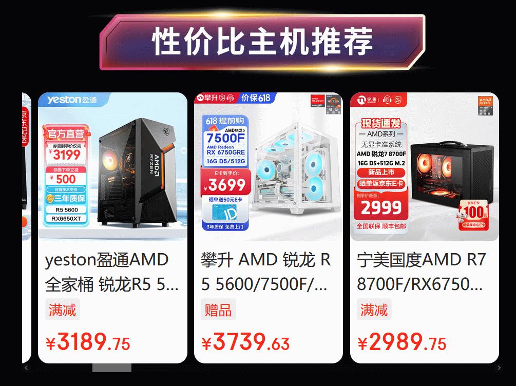 活动中还有不少性价比主机,这些有的专为办公人士打造,有的还能兼顾用户的娱乐需求,对于预算较低但是对整机性能还有一定要求的朋友来说,在这次AMD整机大促中一定可以挑选到一款高性价比的产品。