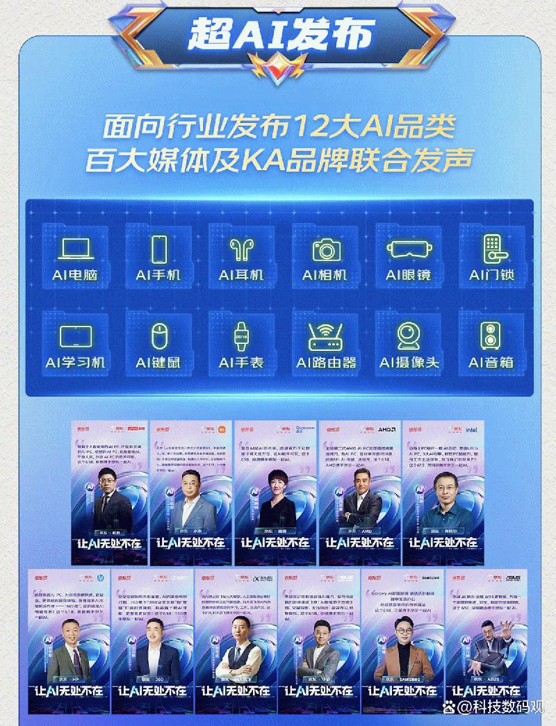 活动获得了百大媒体及3C数码行业大佬联合发声,联想、小米、高通、AMD、英特尔、惠普、360、科大讯飞、华硕、三星在内的一众3C数码大牌先后响应京东AI布局,在社交平台隔空互动热烈喊话,这次618将以AI电脑、AI路由、AI键鼠、AI手表等装备携手京东一起AI,借势京东618让人人可享AI产品带来的便利。