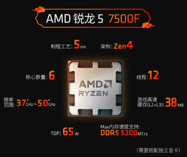 AMD 锐龙5 7500F处理器采用了5nm制程工艺打造的ZEN4架构,配备了6核心12线程的核心配置,5.0GHz的最高加速频率以及38MB的游戏缓存,65W的功耗同时还赠送幽灵散热器。AMD 锐龙5 7500F处理器的游戏性能非常优秀,特别是在国内流行的3A大作和竞技网游上,这样的量身定制让这款入门级游戏处理器同样可以带给玩家们非凡的游戏体验。