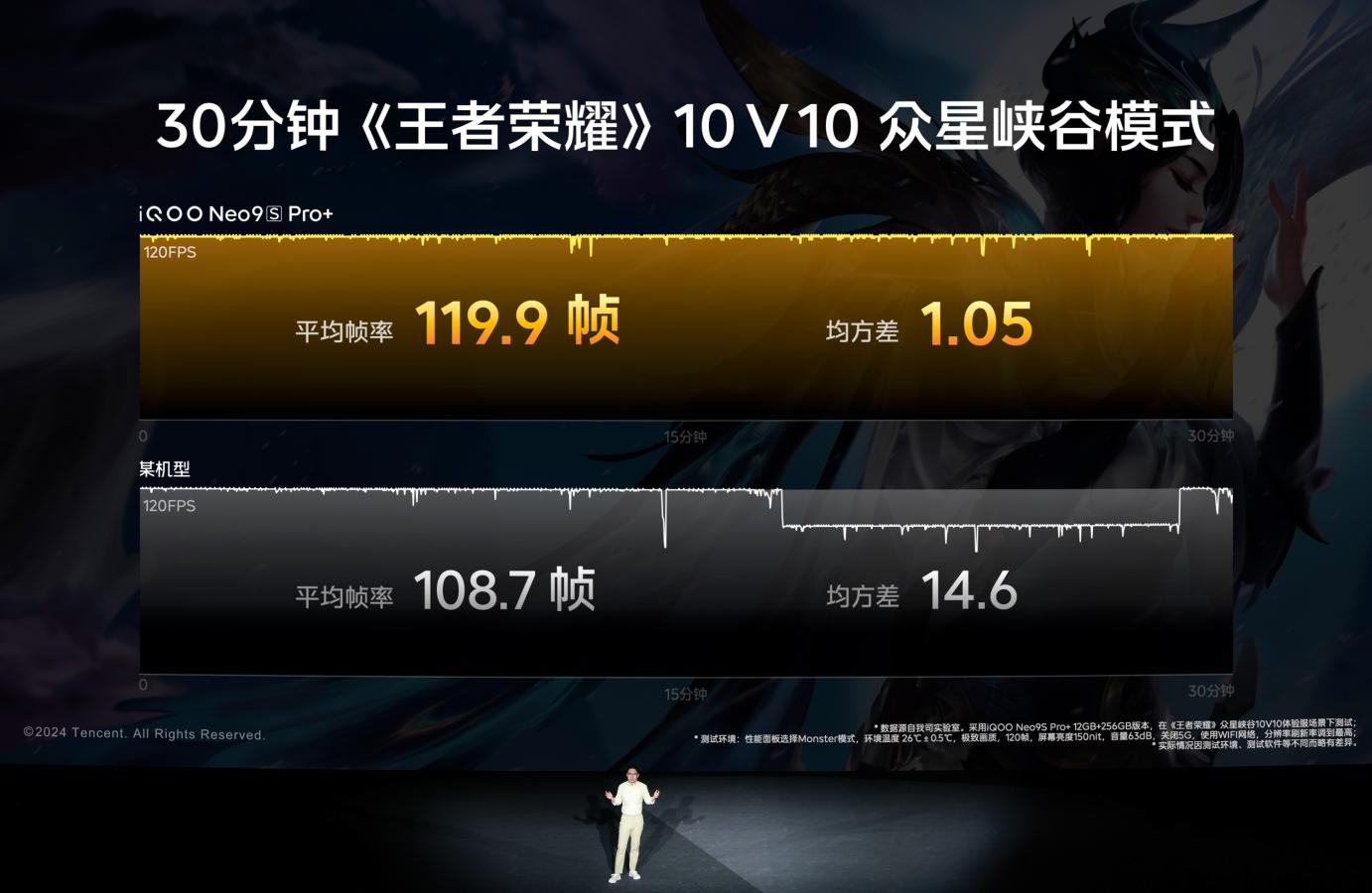 一款性能强大、能耗表现优异且面对高温、重载游戏场景依旧可以稳定、冷静输出的手机,无疑才是游戏玩家心中的“夏日梦想机”。iQOO Neo9S Pro+所搭载的第三代骁龙 8 旗舰芯片与自研电竞芯片 Q1 可谓兼顾性能和能效比的优秀旗舰芯组合,辅以6K天幕VC液冷散热系统,即使长时间重载游戏也能保证始终如一的稳定流畅表现。以《王者荣耀》众星峡谷10V10超重载玩法和35℃高温下玩《王者荣耀》120帧高清模式为例,iQOO Neo9S Pro+半小时游戏平均帧率接近满帧且帧率稳如直线,制霸手机游戏性能赛道。