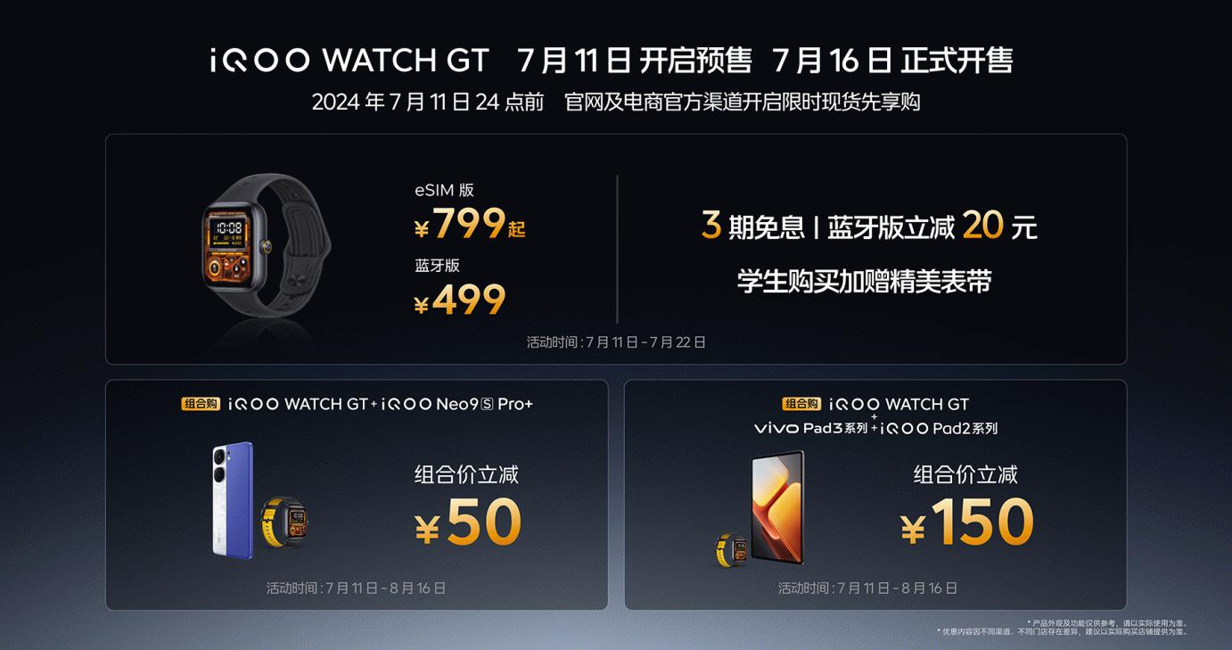 iQOO Neo9S Pro+共有Buff蓝、星曜白和格斗黑三种配色,提供12GB+256GB、12GB+512GB、16GB+256GB、16GB+512GB和16GB+1TB存储组合可选,到手价2899元起;iQOO WATCH GT eSIM版售价799元起,蓝牙版499元,7月11日—7月22日下单蓝牙版立减20元,到手价仅需479元; iQOO Pad2 Pro到手价 3299元起;iQOO TWS 1i售价 99元,与iQOO Neo9S Pro+组合购买可享至高40元优惠,到手仅需59元。