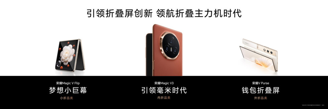 荣耀折叠屏家族目前已完成全形态布局,包括横向内折、横向外折、竖向折叠三种折叠形态,涵盖荣耀Magic V3、荣耀Magic Vs3、荣耀Magic V Flip、荣耀 V Purse四款产品。通过全系产品矩阵的完善以及多梯度价位的布局,进一步打开折叠屏市场多重增量空间,在折叠屏赛道全面领跑,带动折叠屏市场向上爆发增长,开启折叠屏高质量发展全新华章。