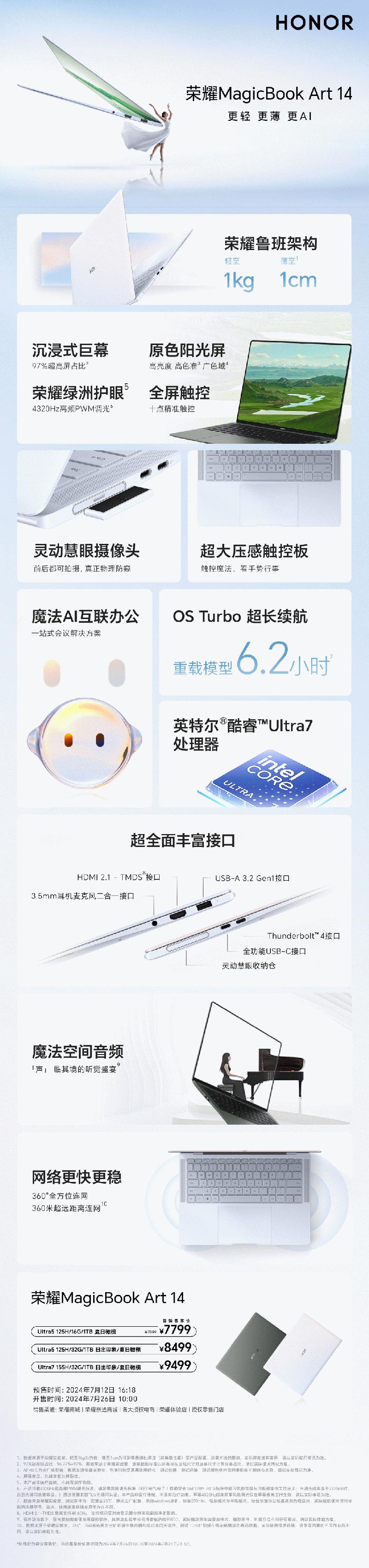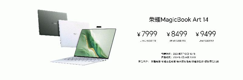 荣耀MagicBook Art 14为消费者提供多种配置选择,Ultra5+16GB+1TB售价7999元;Ultra5+32GB+1TB售价8499元;Ultra7+32GB+1TB售价9499元;7月12日16:18在荣耀商城、各大授权电商、授权零售门店开启全渠道预售,7月26日10:00正式开售。