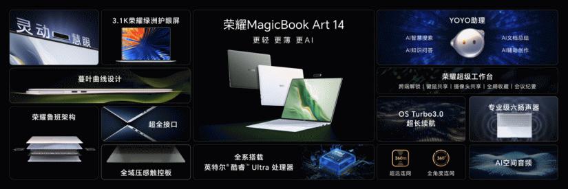 基于AI PC上的领先技术,荣耀把AI技术与用户体验全面融合,用AI使能智能硬件、人机交互和多端生态,构建更懂用户的AI PC体验。今年三月,荣耀首款AI PC荣耀MagicBook Pro 16以兼具轻薄、高性能、长续航的优势,以及“静音性能”模式的亮眼功能,赢得不少赞誉,开启了AI PC全新时代。作为超轻薄领域的首款AI PC产品,荣耀MagicBook Art 14在AI能力和体验上进一步升级,带来更符合用户实际使用需求的场景化人机交互体验,引领AI PC行业新的潮流。