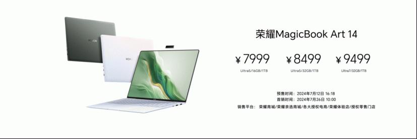 荣耀MagicBook Art 14为消费者提供多种配置选择,Ultra5+16GB+1TB售价7999元;Ultra5+32GB+1TB售价8499元;Ultra7+32GB+1TB售价9499元;7月12日16:18在荣耀商城、各大授权电商、授权零售门店开启全渠道预售,7月26日10:00正式开售。