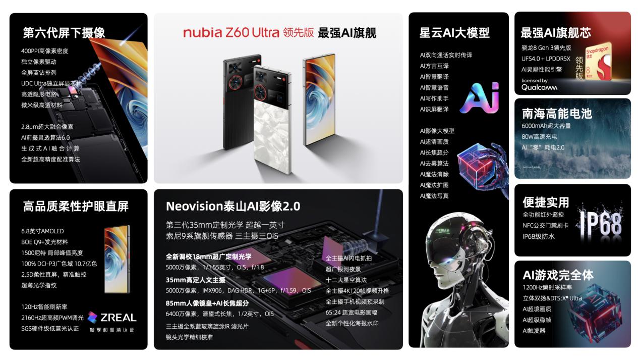 【小熊在线讯】7月23日,努比亚召开AI+双旗舰新品发布会,推出“全面超大升,超强超AI”的努比亚Z60 Ultra领先版和专为年轻人打造的户外“AI神装,星物种”努比亚Z60S Pro。两款新机依托行业领先的自研星云AI大模型,带来独家AI+屏下、独家AI+骁龙最强芯,以及独家Al+卫星通信和独家Al+影像等诸多亮点,为用户带来全方位的AI科技体验。
