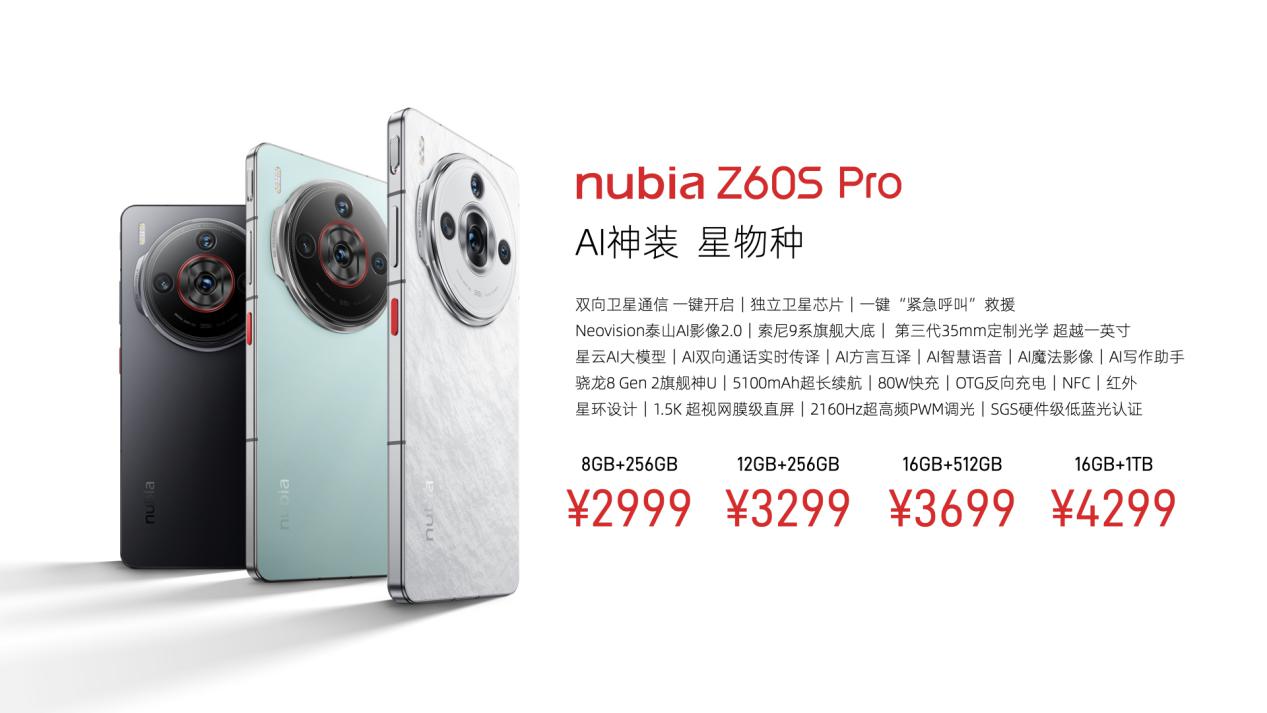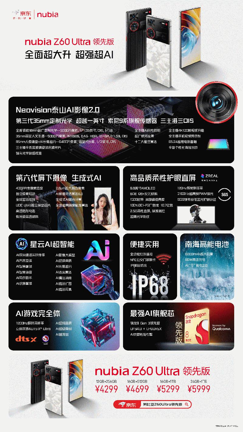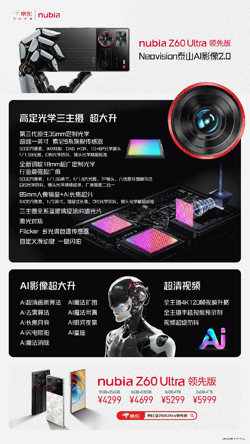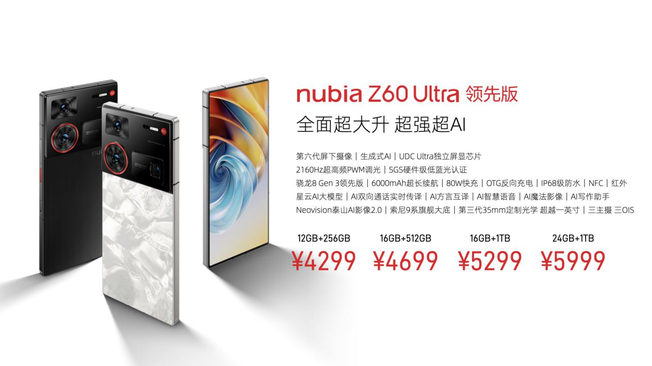 即日起,新品在中兴商城、京东、天猫、抖音、京东之家等各大渠道开启全网预售,并于7月26日全渠道正式开售。努比亚Z60 Ultra领先版拥有竞速黑、冰溪银两种配色,售价4299元起。努比亚Z60S Pro提供玄武黑、碧海青、白月光三款自然配色,售价2999元起。此外,努比亚还联合京东开启先人一步计划,在努比亚京东自营旗舰店可享提前购机。