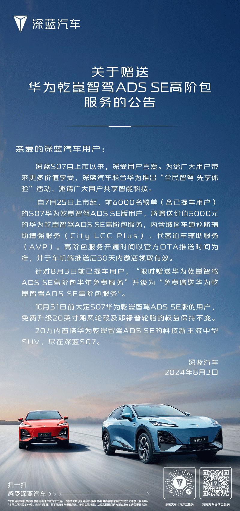 据悉,自7月25日深蓝S07上市以来,前6000名锁单(含已提车客户)的S07华为乾崑智驾ADS SE版用户,将享受价值5000元的华为乾崑智驾ADS SE高阶包终身永久免费订阅服务。这一服务涵盖了City LCC Plus和AVP两大高阶功能,让用户在享受智能驾驶便利的同时,也无需担心未来升级的费用问题。而对于8月3日前已提车的用户,其原有的半年免费订阅服务也将自动升级为终身永久免费订阅,进一步彰显了深蓝汽车对用户的诚意与关怀。