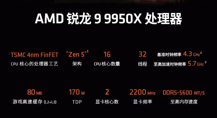 AMD 锐龙9 9950X处理器采用了业界领先的TSMC 4nm FinFET工艺制程的ZEN5架构,搭配16核心32线程的高规格配置和高达5.7GHz的最高频率,总计80MB的游戏缓存和170W的功耗让它专为发烧玩家设计。