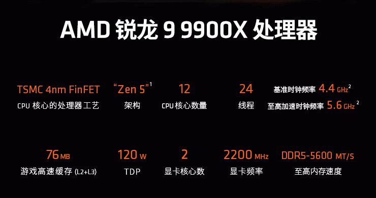 AMD 锐龙9 9900X处理器同样采用了TSMC 4nm FinFET工艺制程的ZEN5架构,搭配12核心24线程的高规格配置和高达5.6GHz的最高频率,总计76MB的游戏缓存和120W的功耗设计让它非常适合高端游戏玩家使用。