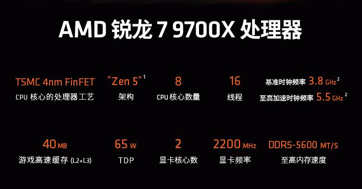 AMD 锐龙7 9700X处理器依然采用了TSMC 4nm FinFET工艺制程的ZEN5架构,搭配8核心16线程的配置和高达5.5GHz的最高频率,总计40MB的游戏缓存和65W的功耗设计非常适合主流玩家使用。