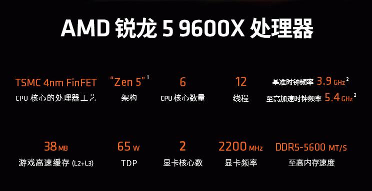 最后这款AMD 锐龙5 9600X处理器采用了TSMC 4nm FinFET工艺制程的ZEN5架构,搭配6核心12线程的配置和高达5.4GHz的最高频率,总计38MB的游戏缓存和65W的功耗设计适合各类入门级玩家使用。