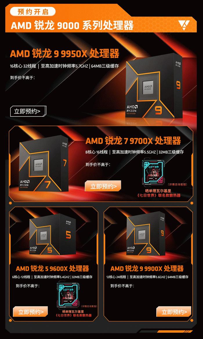 AMD 锐龙9000系列台式机处理器共有四款首发产品,它们分别是AMD 锐龙9 9950X处理器、AMD 锐龙9 9900X处理器、AMD 锐龙7 9700X处理器和AMD 锐龙5 9600X处理器。在全面启航活动上线后,广大DIY玩家已经可以看到后续产品正式发售后的活动了,包括最受大家期待的晒单赠送瓦尔基里《七日世界》联名款散热器活动还有很多AMD京东商城自营旗舰店的活动。