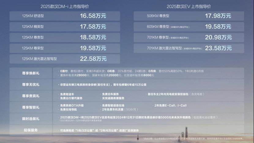 其中,2025款汉EV共推出4款车型,售价17.98万~23.58万元;2025款汉DM-i共推出5款车型,售价16.58万~22.58万元。同时,比亚迪为用户准备了包括“尊享焕新礼、尊享无忧礼、尊享贵宾礼、尊享智联礼、限时选装礼、延保服务”六重购车礼遇。值得一提的是,2024年12月31日前,购车可限时免费选装未央灰车色与黑化运动套件,总价值5000元。