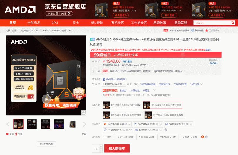 目前AMD 锐龙5 9600X处理器在京东自营旗舰店的报价是1949元,新品首发期有晒单返京东E卡的主要活动,以旧换新享至高500元补贴,而30天京东价保让大家无惧降价,成为京东旗舰店会员还有首购返京豆和多重会员福利可享。目前AMD“开学换芯 装备升级”的促销活动正在火热进行中,同学们可以前往上面的活动页面好好挑选,除了CPU其它硬件产品也都可以一站购全。