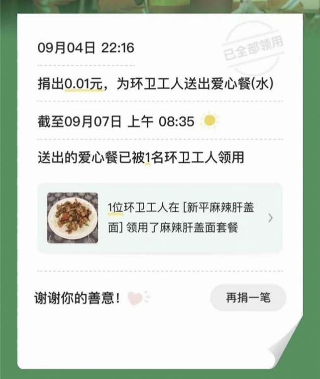 9月4日,刘先生捐出1分钱,为环卫工人送出爱心餐(水)。9月7日上午,他收到了腾讯公益平台的一份推送信息,1位环卫工人在一家店领用了麻辣肝盖面套餐。高效的反馈机制,让刘先生忍不住再捐了10元。一分钱传递出的善意,激发出又一份善意。