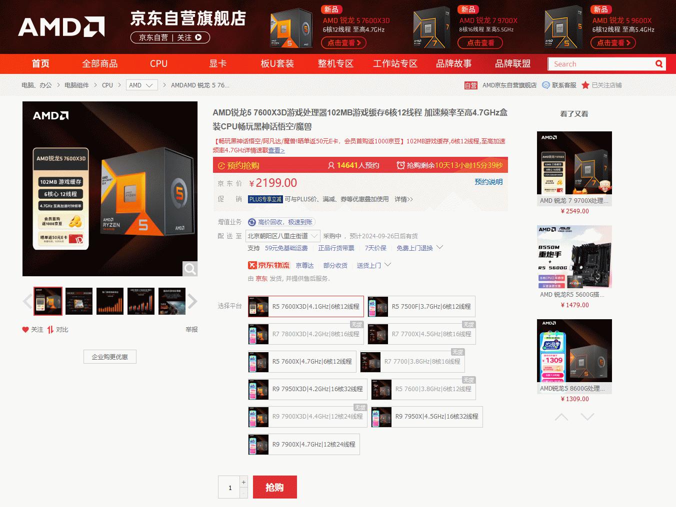 目前AMD 锐龙5 7600X3D处理器在京东自营旗舰店的首发售价是2199元,已经预约了的DIY玩家们可以直接下单。对于近期准备攒机的主流游戏玩家来说,搭配B650/A620芯片组主板来打造平台,AMD 锐龙5 7600X3D将会成为大家全新的游戏神器。