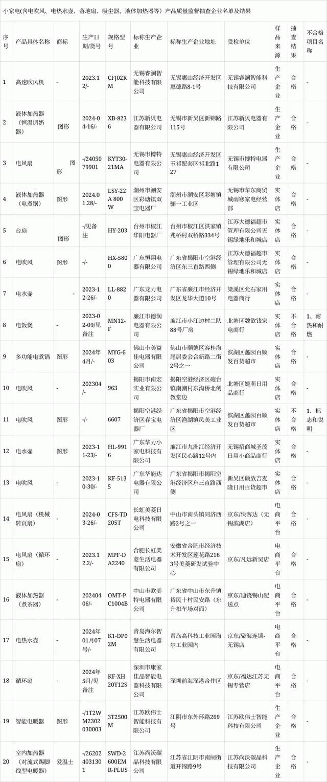 结果显示,2024年度,无锡市市场监督管理局对小家电(含电吹风、电热水壶、落地扇、吸尘器、液体加热器等)产品质量进行了监督抽查。共抽查产品20批次,不合格产品2批次,不合格发现率为10%。