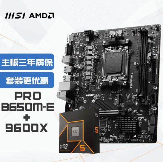 接下来这款套装的价格更加亲民,是由锐龙5 9600X和微星 PRO B650M-E 主板组成,这款产品是一款专为追求性能与效率的用户设计的高性价比主板,它功能丰富,基于AMD B650芯片组,专为AMD平台优化,适合搭载AMD锐龙7000/9000系列的主流产品,为用户提供稳定且高效的计算基础。
