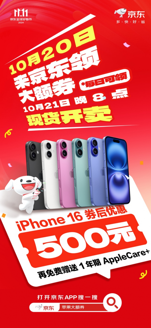 iPhone 16系列京东11.11至高优惠1600元还赠一年AppleCare+ 10.21晚8现货开售