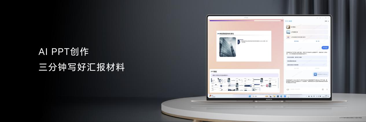 同时,荣耀MagicBook Art 14骁龙版还内置了行业领先的PC AI 能力体系,不仅继承了荣耀MagicBook Art 14所支持的AI智慧搜索、AI知识问答、AI文档总结、AI辅助创作等AI能力,还带来了全新升级的智慧搜索功能,支持视频、图片、文档内容的快速直达搜索;而全新推出的AI PPT创作功能,可根据用户输入的主题内容或上传的文档自动生成PPT,大幅提升工作和学习效率,重塑AI PC终端体验。