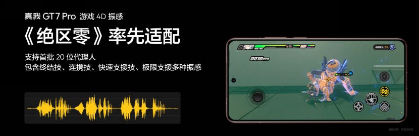 此外,真我GT7 Pro更是致力于让每位玩家都可以享受专业电竞的乐趣,为此带来“AI大神辅助2.0”、“游戏4D振感”等多项全新游戏功能。AI大神辅助2.0,新增全队AI辅助功能,可将AI辅助建议通过语音自动共享队友,让全队上分如有神助。而游戏4D振感则是真我联合瑞声科技首发,以AI识别游戏的角色、技能、武器,配合技能输出提供逐秒级振动反馈,目前该功能适配热门ARPG手游《绝区零》、《王者荣耀》。此外,真我GT7 Pro全方面适配热门手游《金铲铲之战》至臻画质和120帧模式,游玩体验更畅爽。