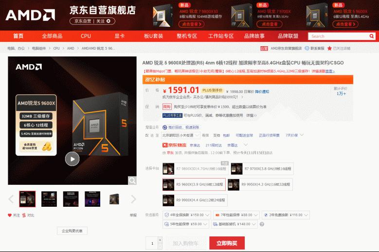 【小熊在线】京东商城的11.11大促虽然已经落幕了,但是很多商品的价格整体上还是有了一定的调整,虽然没有了大促补贴那样的神价,但是较之前的日常售价也更加优惠了。正如AMD(超威)京东自营旗舰店上热卖的锐龙9000系列处理器,在11.11大促期间成为了很多DIY玩家们的首选,特别是这款性价比极高的AMD 锐龙5 9600X处理器更是受到了大家的青睐。