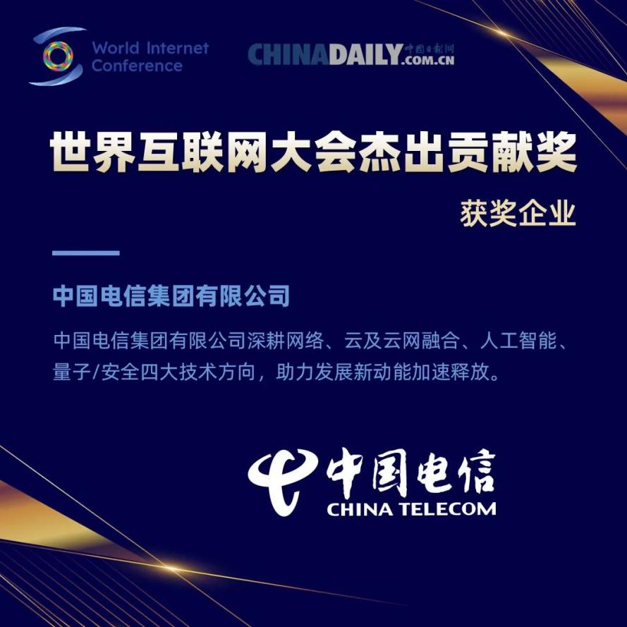 世界互联网大会已连续举办11届,站在“下一个十年”的新起点,大会今年重磅设置“世界互联网大会杰出贡献奖”。该奖项共分为三大类别,分别是社会贡献类、创新突破类和成长潜力类,共有14家企业荣获这三个类别的奖项,覆盖5G、人工智能、芯片设计、云计算和网络安全等行业,中国电信获得创新突破类奖项。本次获奖是对公司科技创新领域积极探索与实践的充分肯定,中国电信将坚持科技引领,进一步加强开放合作,为数字经济高质量发展贡献电信力量。