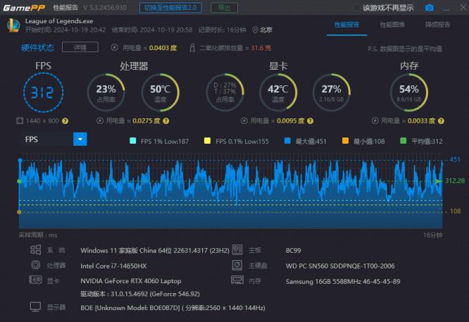 对于国民级的游戏《英雄联盟》,光影精灵10在2K最高画质下展现出了强大的性能,最高帧率达到了451帧,平均帧率也稳定在了312帧。这样的表现无疑能够确保玩家在游戏中享受到流畅无阻的体验,无论是激烈的团战还是快速的技能释放,都能得到完美的呈现。