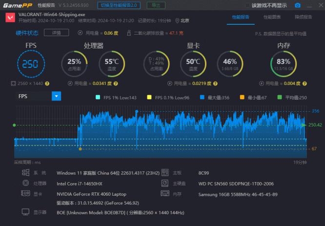 而作为《无畏契约》的合作伙伴,惠普的光影精灵10在这款对帧率要求较高的游戏上也同样表现出色。在2K分辨率和最高画质的设置下,最高帧率达到了356帧,平均帧率也有250帧。这样的性能表现足以满足玩家对于高帧率游戏的需求,确保在游戏中能够做出快速且精准的反应。