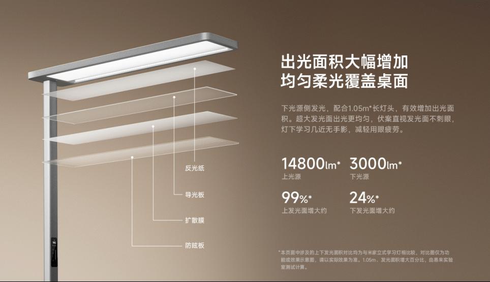 米家立式学习灯Pro通过上下双光源设计,实现了桌面和空间的全面均匀照明。下光源采用1.05米长的侧发光灯头,大幅增加出光面积,使光线更加柔和均匀,有效减少直视灯光时的刺眼感,减轻眼部疲劳。而上光源配备了540颗全光谱灯珠,利用天花板反射技术提升空间整体亮度,同时降低环境光和桌面光的明暗差异,为用户提供更自然的学习光线。