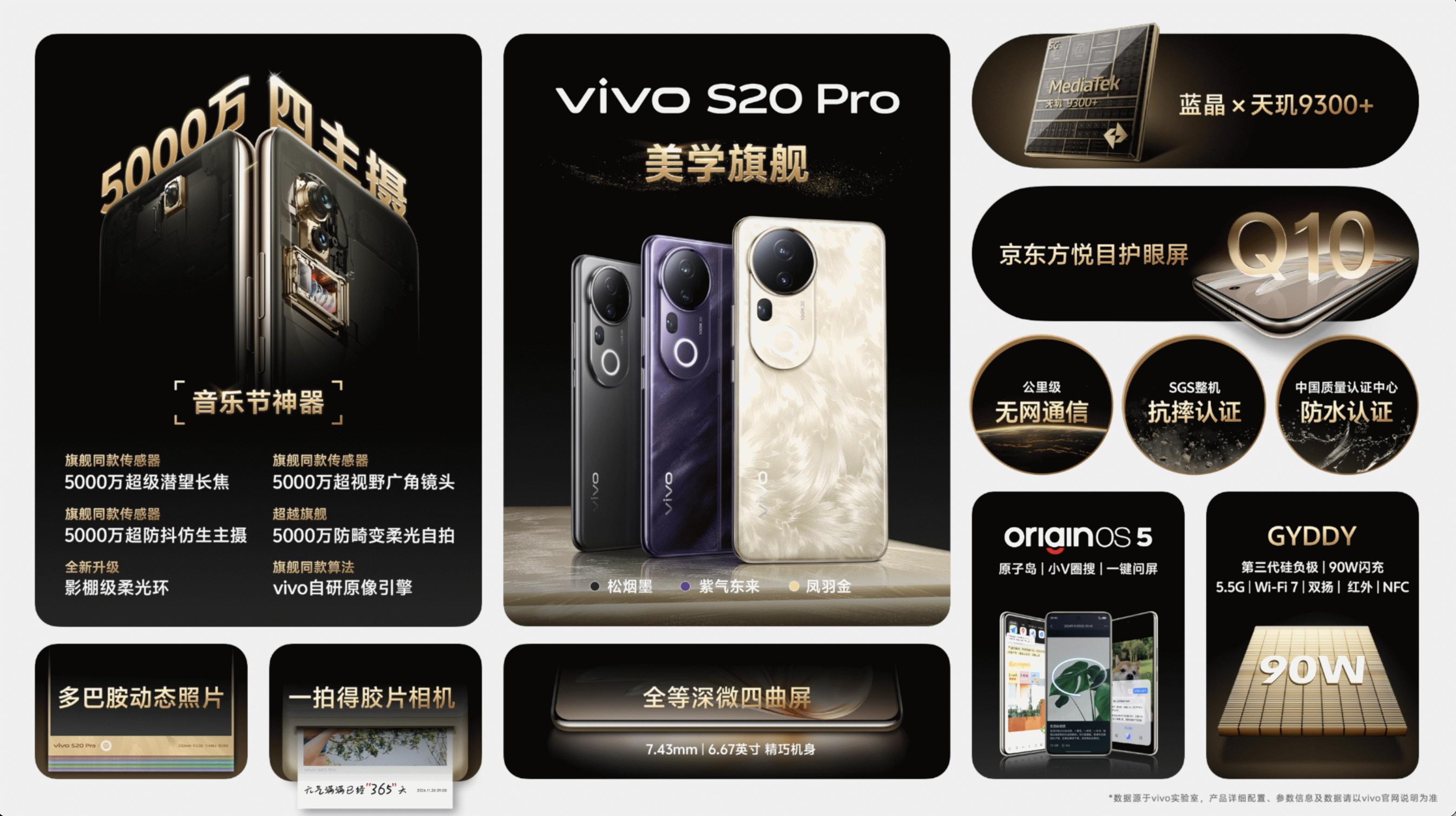 vivo S20 Pro持续探索中国设计的时尚表达,推出凤羽金、紫气东来、松烟墨三款配色;前后5000万旗舰柔光四主摄,集成五大黄金人像焦段,打造年轻人的音乐节神器;蓝晶×天玑9300+旗舰芯、京东方Q10悦目护眼屏和公里级无网通信等全面向旗舰看齐。vivo S20同样带来东方美学配色与影棚级人像,但更轻薄,以7.19mm超薄、6500mAh超大容量电池刷新轻薄续航新纪录。