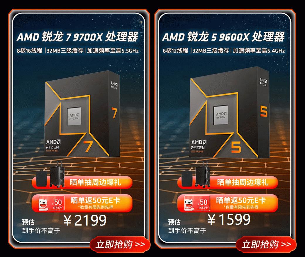 对于准备购买AMD 锐龙5 9600X处理器和AMD 锐龙7 9700X处理器的玩家们请先关注一下AMD京东自营旗舰店,大家可以参与晒单返E卡和抽周边壕礼的活动,成为京东旗舰店会员还有首购返京豆和多重会员福利可享。下面就来简单来介绍下这两款最为热卖的AMD 锐龙9000处理器。