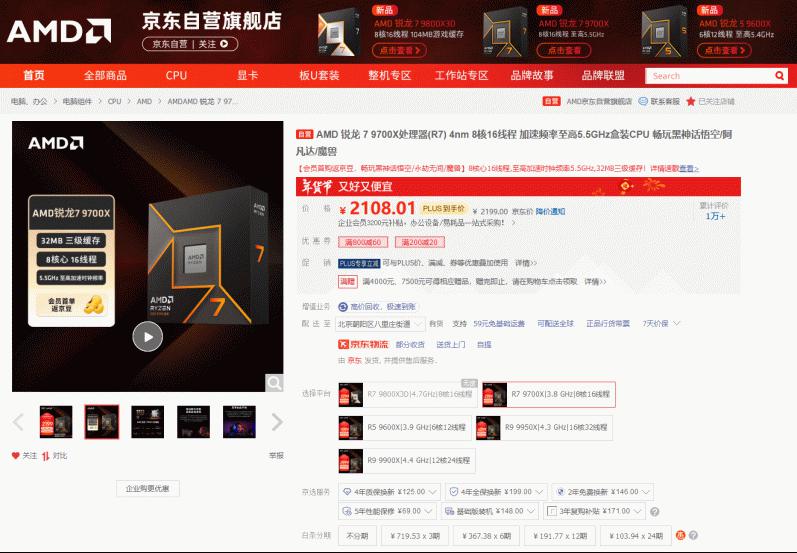 年货节限时好价必须冲!AMD 锐龙7 9700X京东热卖中