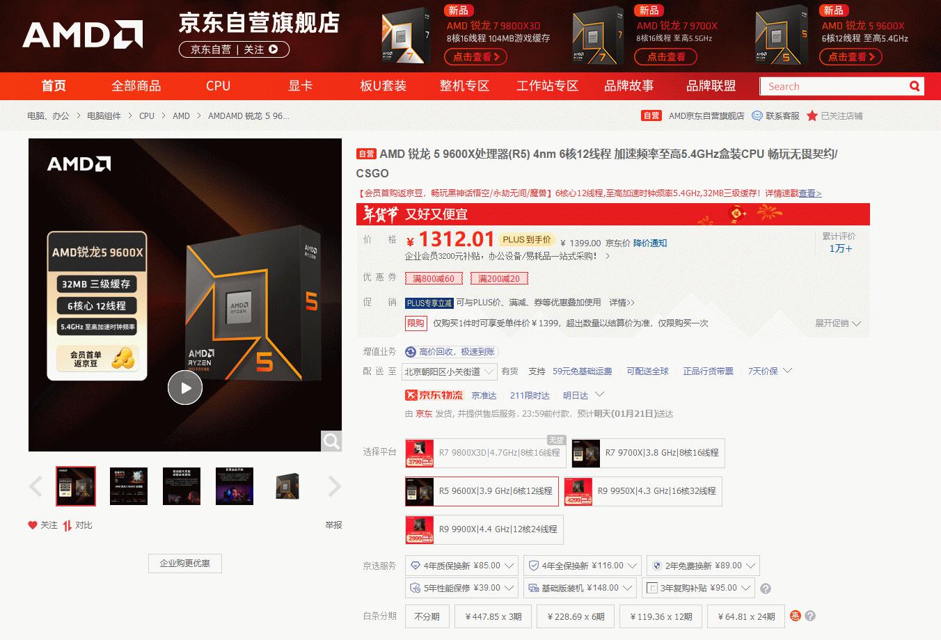 目前AMD 锐龙5 9600X处理器在京东自营旗舰店的最新报价是1399元, 叠加限时优惠券和PLUS会员年货节的补贴,到手只要1312元。朋友们在购买之后还可以参与晒单抽周边壕礼的活动(指定型号前往页面查看),成为京东旗舰店会员还有首购返666京豆和积分抽大奖活动。目前AMD 锐龙5 9600X处理器的售价就是史低价格,无论是想要年前升级平台和攒机的用户,还是观望好价的用户,现在就是出手的最佳时机!