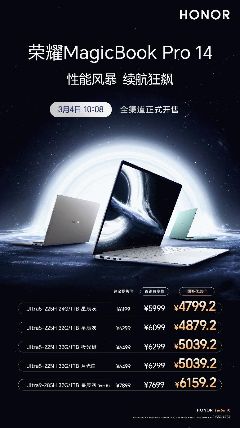 3月4日,荣耀笔记本新品MagicBook Pro 14正式开启首销,Ultra5+24GB+1TB国补到手价4799.2元,Ultra5+32GB+1TB国补到手价4879.2元,Ultra9+32GB+1TB触屏版国补到手价6159.2元。