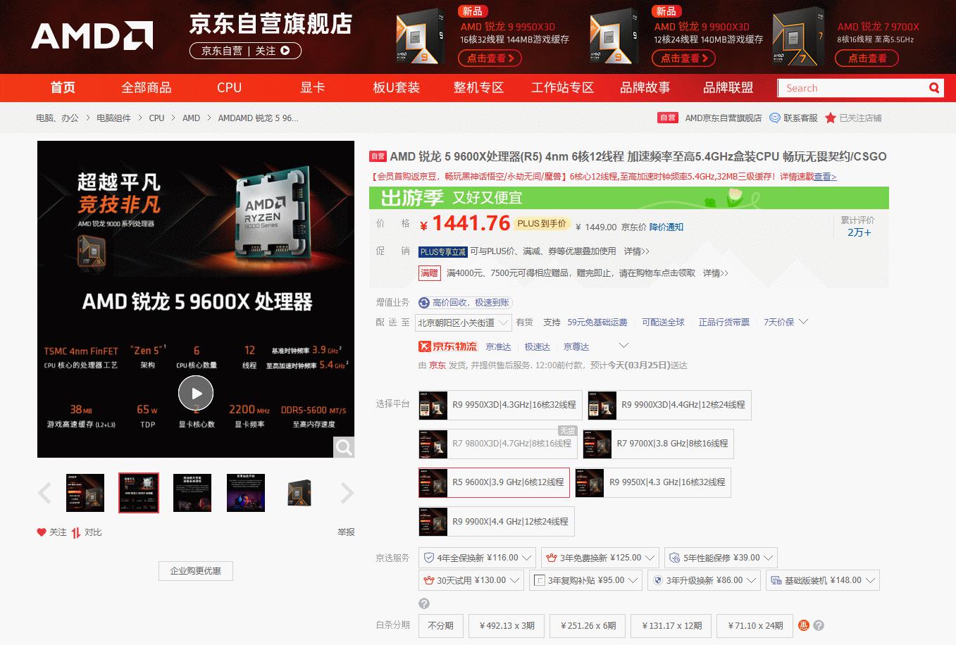 目前AMD 锐龙5 9600X处理器在京东自营旗舰店的最新报价是1449元,京东PLUS会员到手更加优惠。朋友们在购买之后还可以参与晒单抽周边壕礼的活动(指定型号前往页面查看),成为京东旗舰店会员还有首购返666京豆和积分抽大奖活动。综合三月来看,AMD 锐龙5 9600X处理器近期的价格比较平稳,有需要升级换代或者攒新机的朋友可以随时下单了。